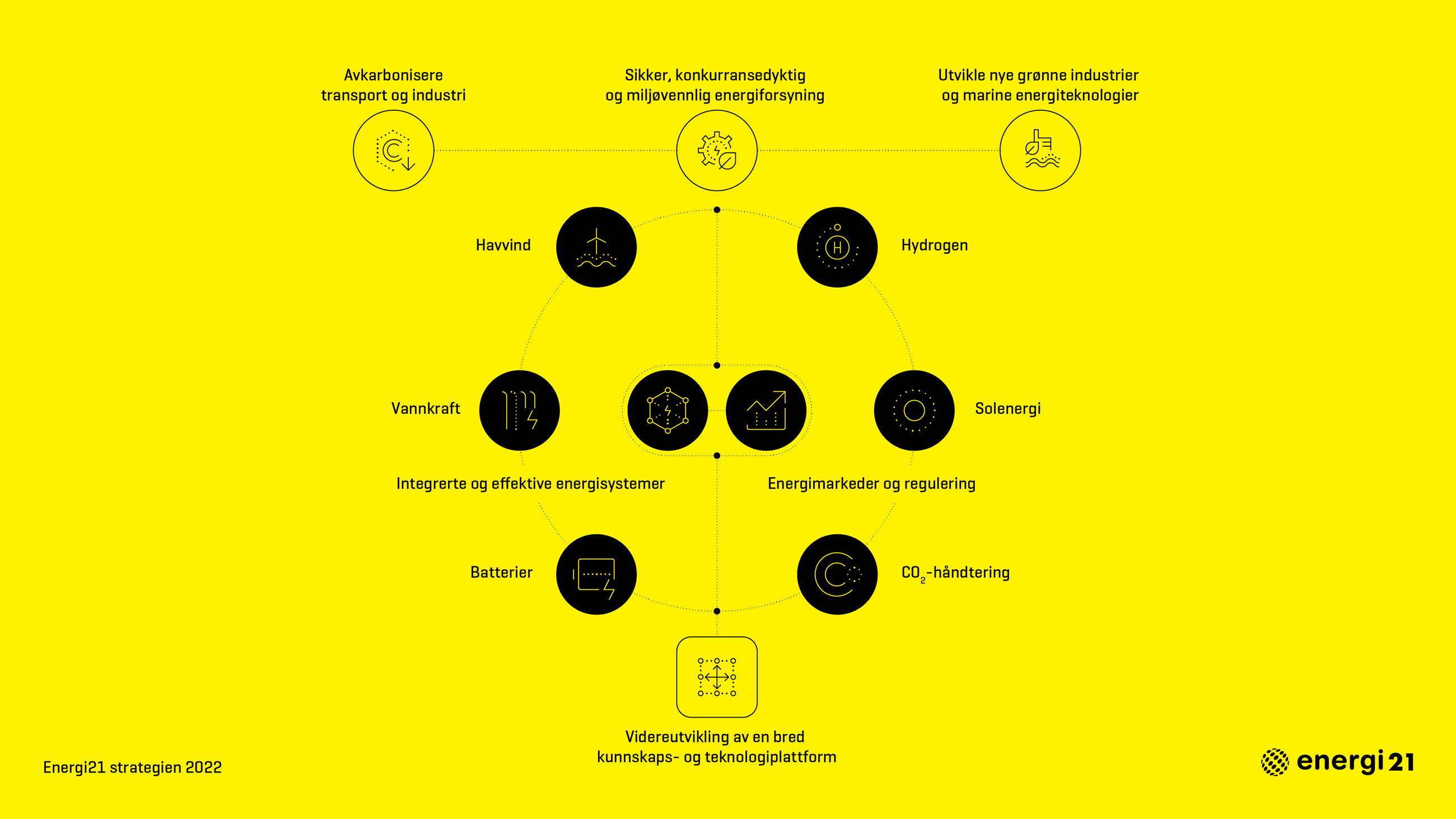 Energi21 strategiens satsingsområder har potensiale for verdiskaping innen ressursutnyttelse og videreutvikling av en leverandørindustri mot nasjonale og internasjonale energimarkeder. I tillegg representerer satsingsområdene teknologi- og temaområder med stor betydning for å sikre forsyningssikkerheten og bidra til effektiv utvikling av lavutslippssamfunnet.